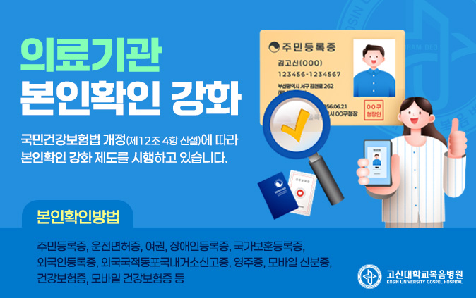 고신대학교복음병원 (이하 병원이라 함)은 귀하의 개인정보보호를 매우 중요시하며, 『개인정보보호법』을 준수하고 있습니다. 병원은 개인정보처리방침을 통하여 귀하께서 제공하시는